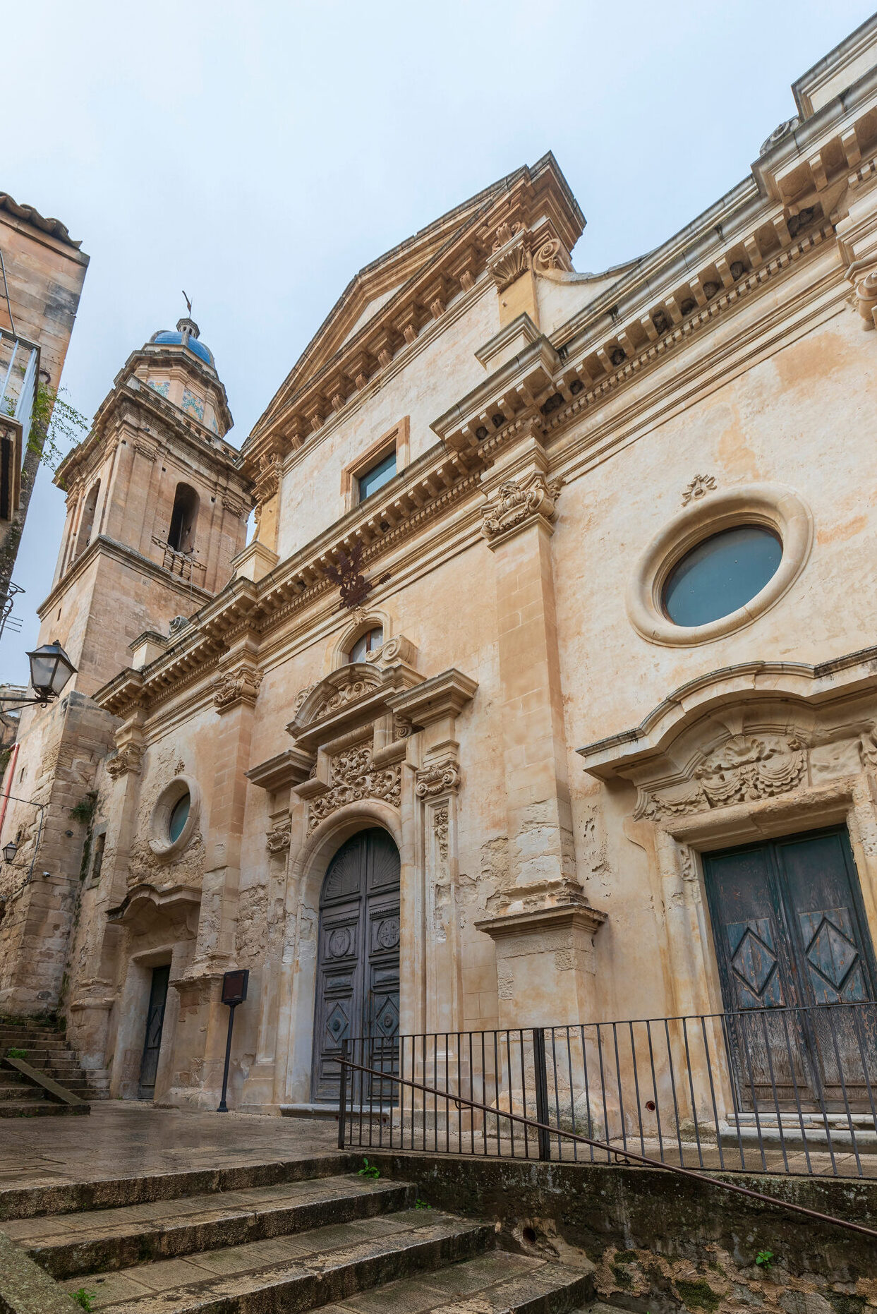 The bell tower, dated 1754, is a very distinctive element of the Ibla landscape. It is surmounted by an octagonal tambour housing eight polychrome terracotta panels featuring floral vases. The tower ends with a ribbed dome covered with blue majolica (Fig. a).