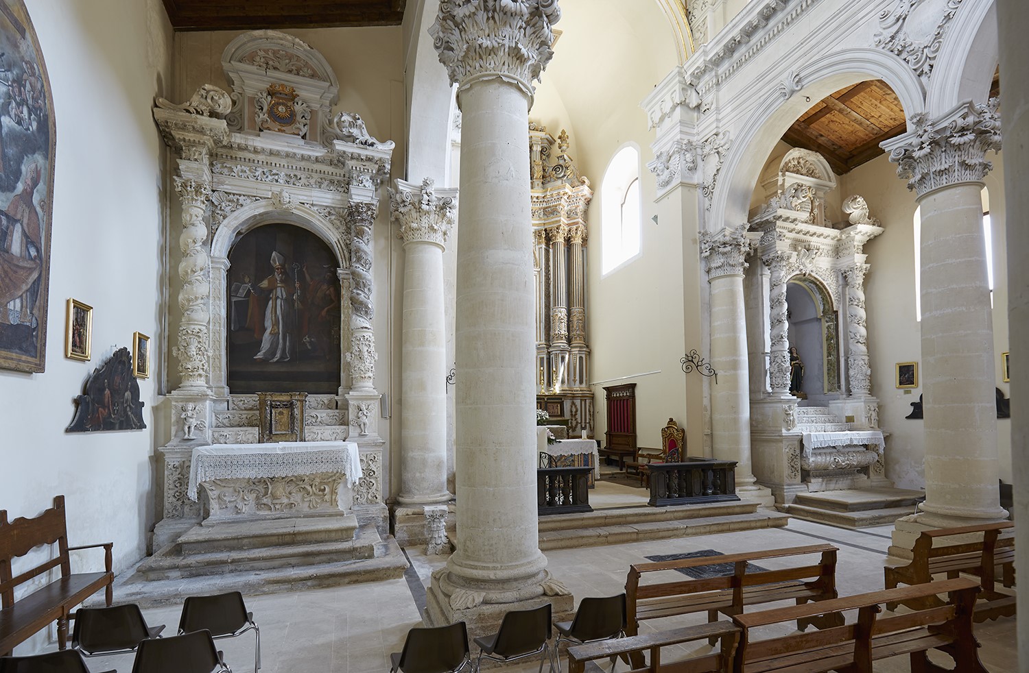 The church’s interior has three naves, separated by columns with Corinthian capitals (Fig. d). Interesting are the Chapel of Our Lady of Sorrows, to the right for those entering (Fig. e), on the right entering,and the five altars, made between 1741 and 1758, some characterised by rich decorations and others by twisted columns of Rococo inspiration. In the left aisle, there is a painting on the altar depicting St. Julian and St. John the Baptist, which is attributed to Mattia Preti (Fig. f).