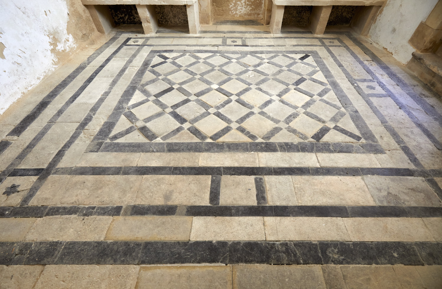 A number of interior floorings are of interest: a “pietra pece” and white stone interlaced floor of considerable importance and a “pietra pece” and white stone inlaid floor, with rosettes and squares made of “pietra pece” blocks (Fig. f).