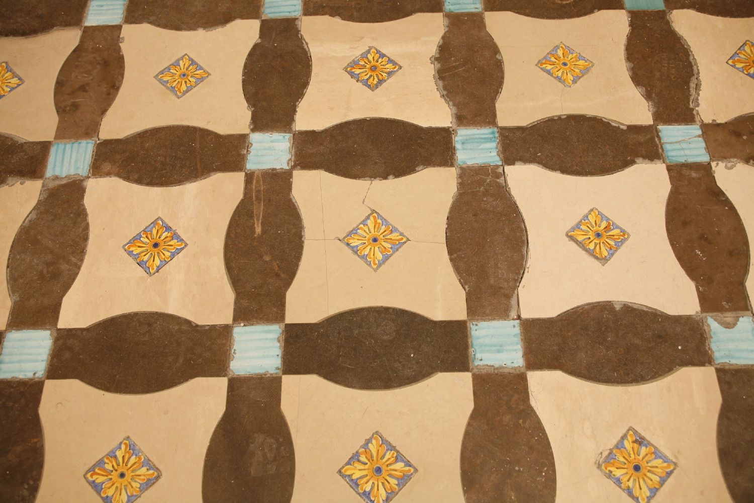 Like all eighteenth-century palaces, the “piano nobile” (noble floor) is characterised by an “enfilade” (a row of rooms), with the reception hall in the middle, adorned with a silk-woven Chinese tapestry (Fig. e). It is still possible to see the reed and plaster vaults and the lacquered doors from the eighteenth century as well as some crystal chandeliers. Despite some alterations, it still retains many original features, such as the floors, some in pitchstone, others in Caltagirone and Neapolitan majolica (Fig. f).