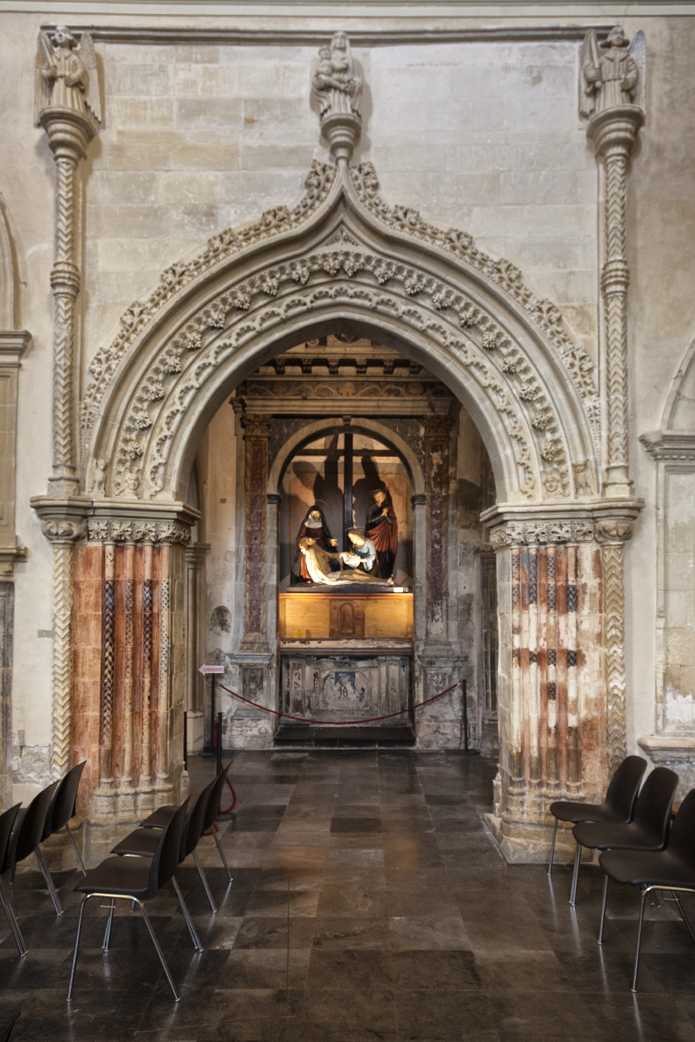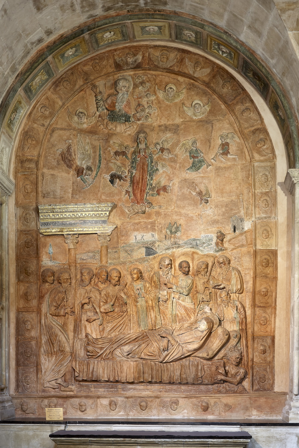 During a recent restoration, in the first chapel, near the altar of the crucifix, a fresco from the 1400s depicting a crucifixion emerged under a layer of paint (Fig. . c). The second chapel, dedicated to the Virgin Mary, can be entered through a Gothic portal richly decorated with limestone carvings and the corbels of the vaults depicting faces (Fig. d). An exceptional terracotta altarpiece from 1538, originally glazed, is located inside the chapel, rebuilt in Renaissance style. Sadly, the Dormitio Virginis (Fig. e) has lost its original glazing and coloration due to clumsy restorations. It is possible that the work was created by a ceramist who had contact with the Della Robbia family as a result of the representational features.