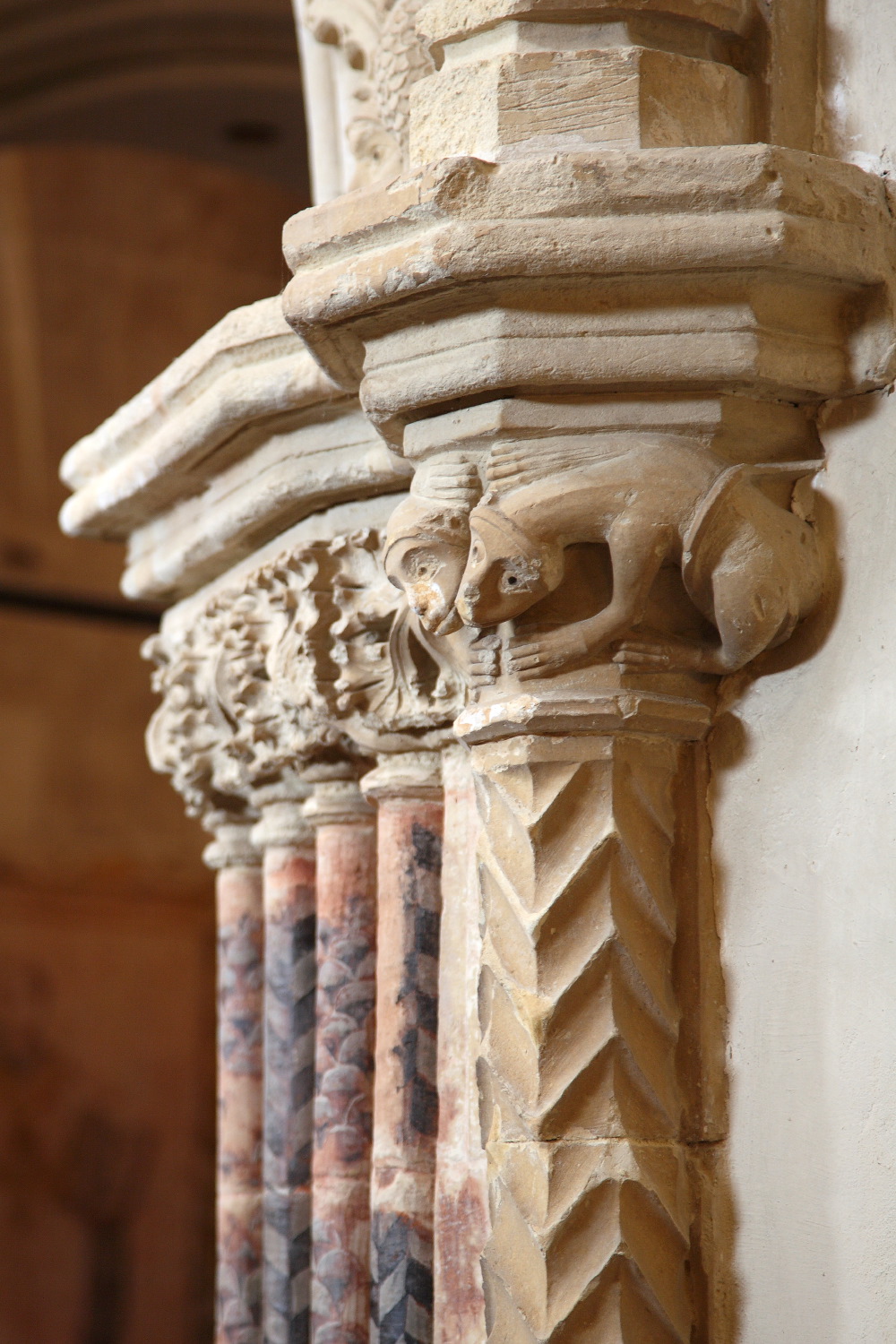 All the Gothic arches are adorned with sculptures depicting celestial creatures, monstrous or fantastic animals, typical of the medieval bestiary (Fig. f) , whose allegory is difficult to interpret, such as, for example, the otter that swallows itself, representing lust for Dante Alighieri, for others envy that gnaws within.