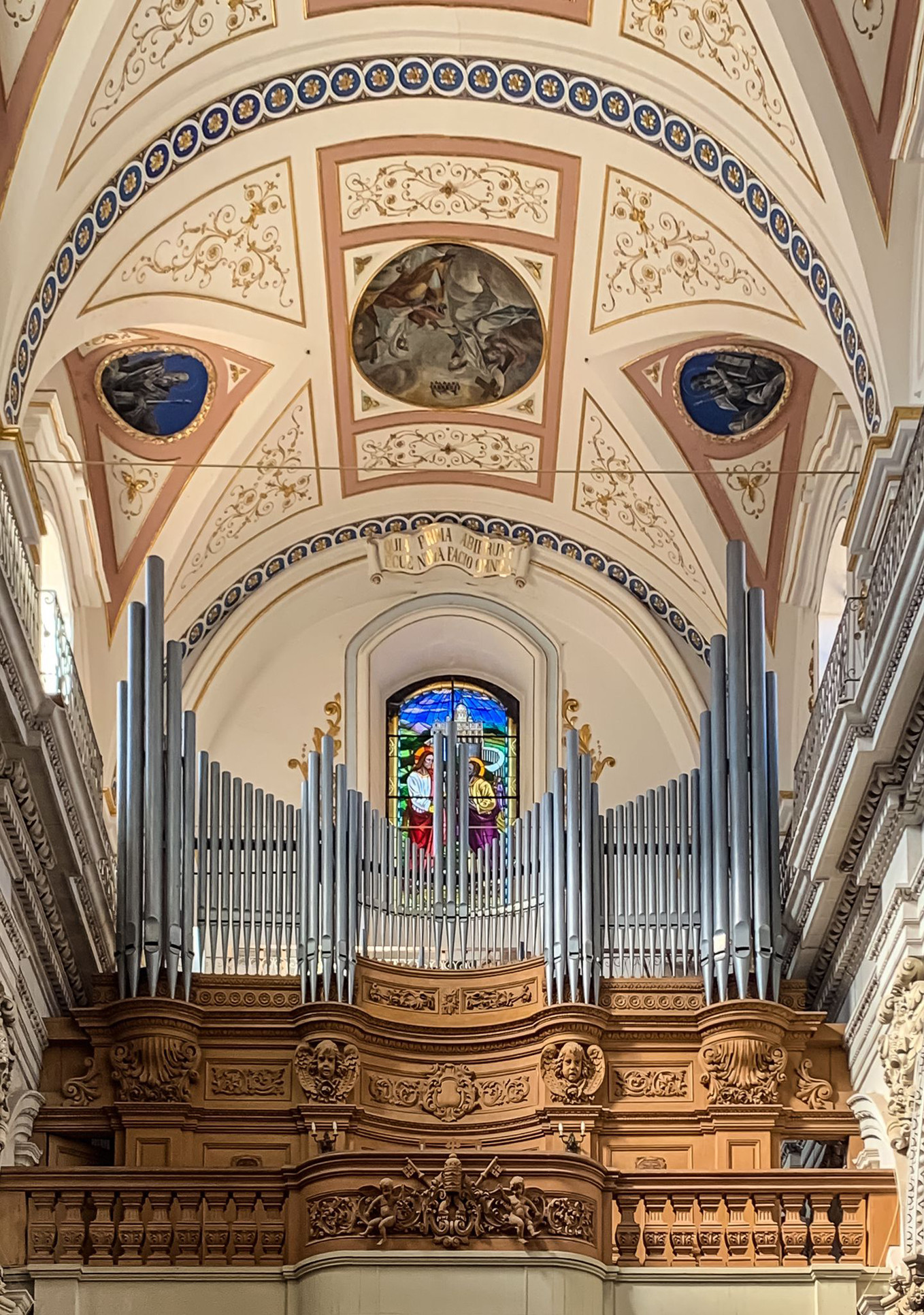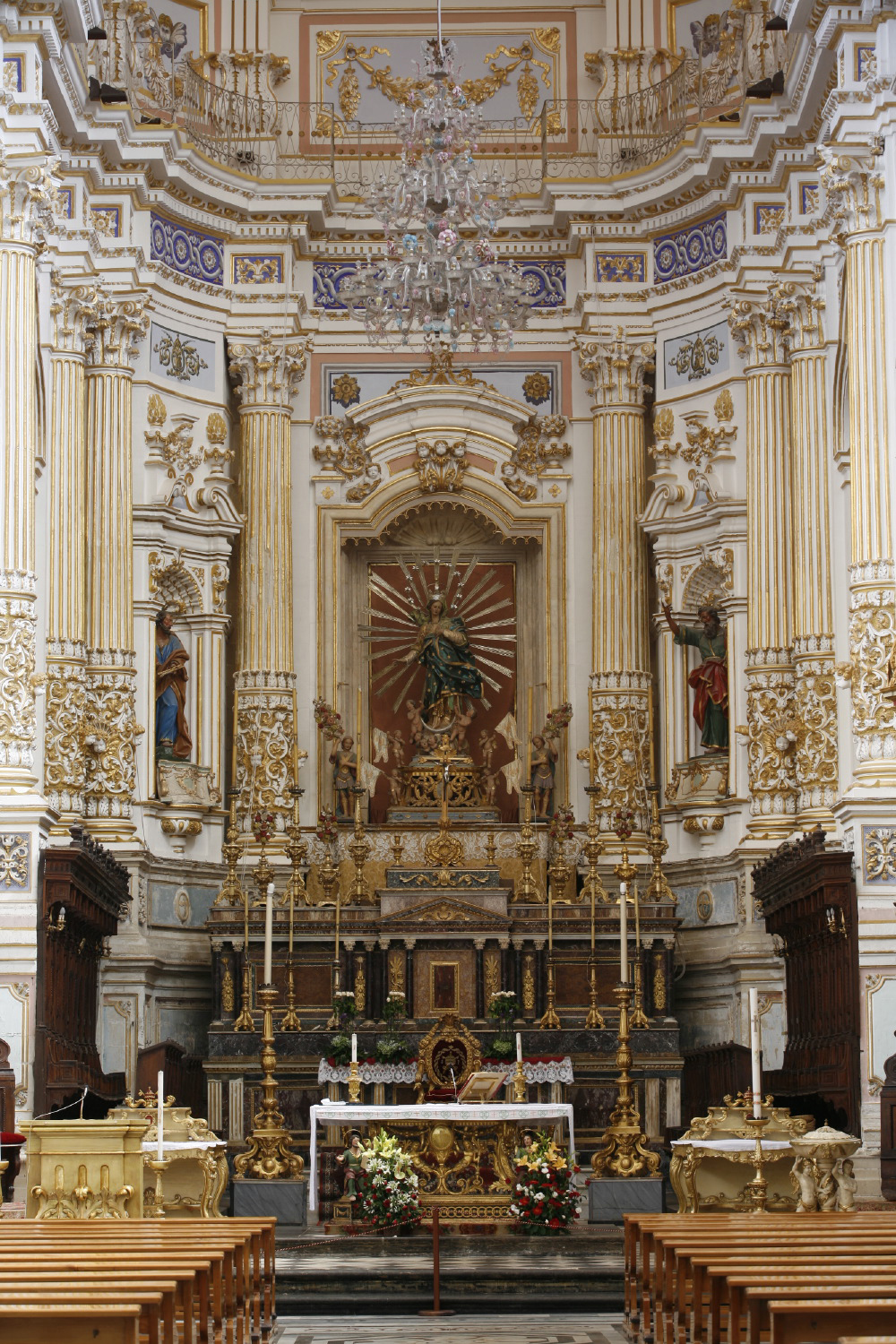 L’interno della chiesa è a tre navate, separate da due colonnati con capitelli corinzi che sorreggono una balconata, sulla quale si trovano delle finestre che illuminano l’interno (Fig. d). La navata centrale ha una volta a botte dipinta con scene dell’Antico e Nuovo Testamento. Il maestoso organo composto da 1800 canne, posto sulla cantoria sopra il portale d’ingresso,  è stato costruito dalla ditta Polizzi, celebri organari siciliani (Fig. e). Le navate laterali, hanno, invece, volte a crociera e sono decorate con stucchi dorati.