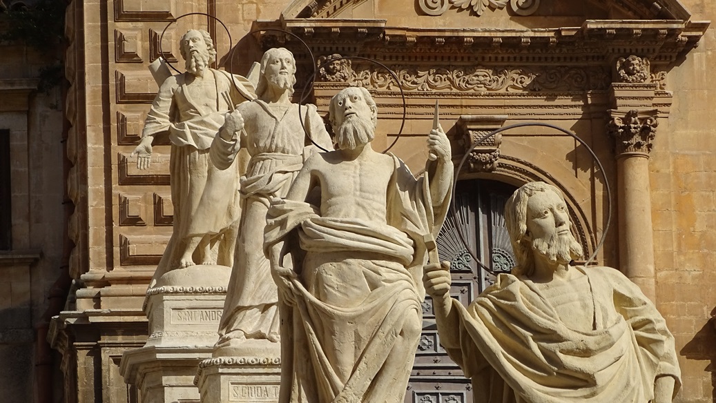 La chiesa, già esistente nel XIV secolo, fu distrutta dal terremoto del 1693 e venne ricostruita all’inizio del XVIII secolo in cima a una grande scalinata (Fig. a), dove sono poste le statue dei dodici apostoli, detti “Santoni” (Fig. b).