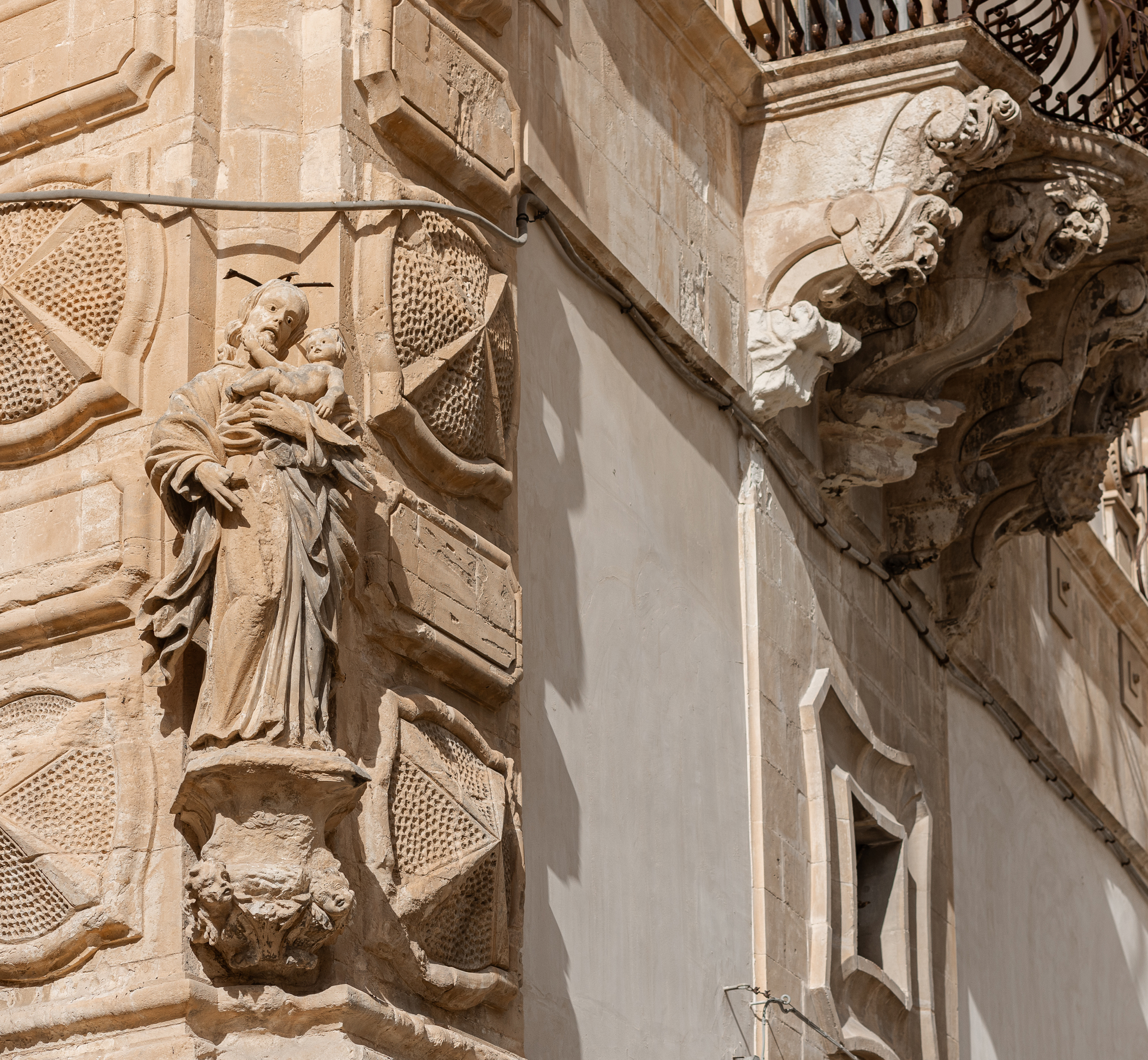 L’impostazione ad angolo, che lo caratterizza e lo mette in risalto, si adatta alla conformazione in pendenza del suolo (Fig. b). Le due facciate sono legate da un possente cantonale, costituito da paraste con bugne lobate. In cima, spicca lo stemma coronato della famiglia Beneventano, che si adagia su due teste di moro a bocca aperta aggettanti (Fig. c), mentre in basso è collocata la statua di San Giuseppe (Fig. d).