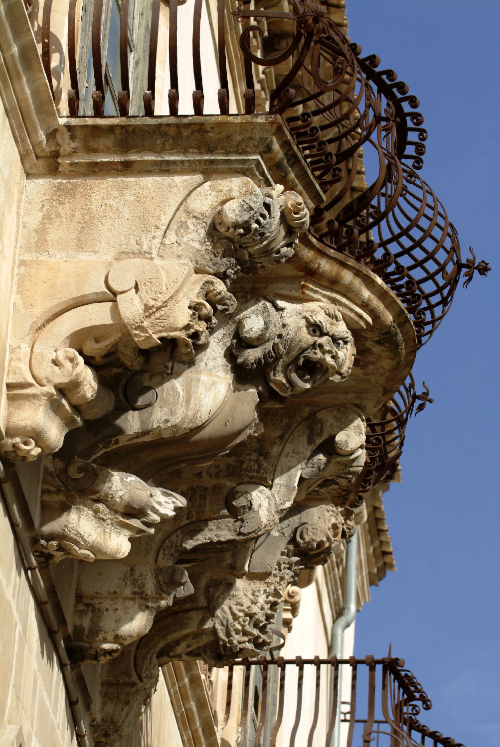Nel secondo ordine i balconi, in asse con le sottostanti aperture, sono sorretti da mensoloni realizzati con motivi scultorei mostruosi e grotteschi, che raffigurano animali fantastici e hanno ringhiere in ferro battuto a petto d’oca (Fig. e).